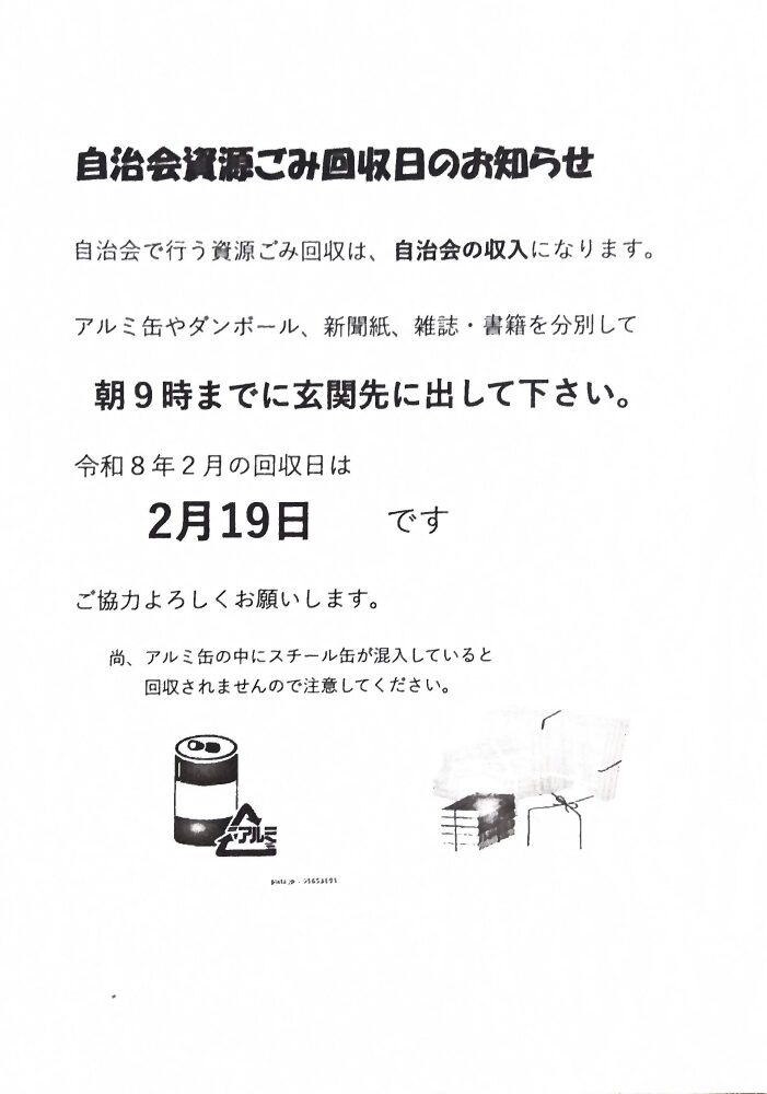 自治会資源ごみ回収のお知らせ